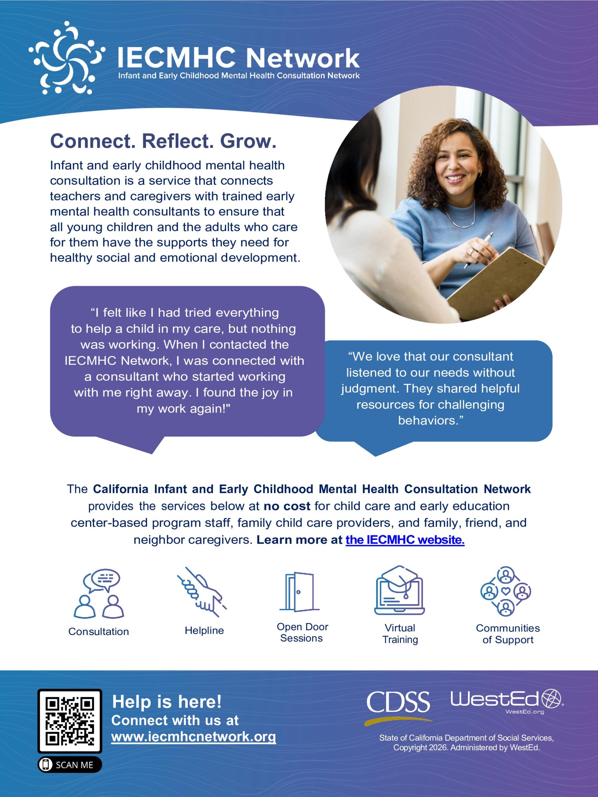 The IECMHC Network offers consultation services at no cost in English and Spanish to child care and early education center-based program staff, family child care home providers, and family, friend, and neighbor caregivers.