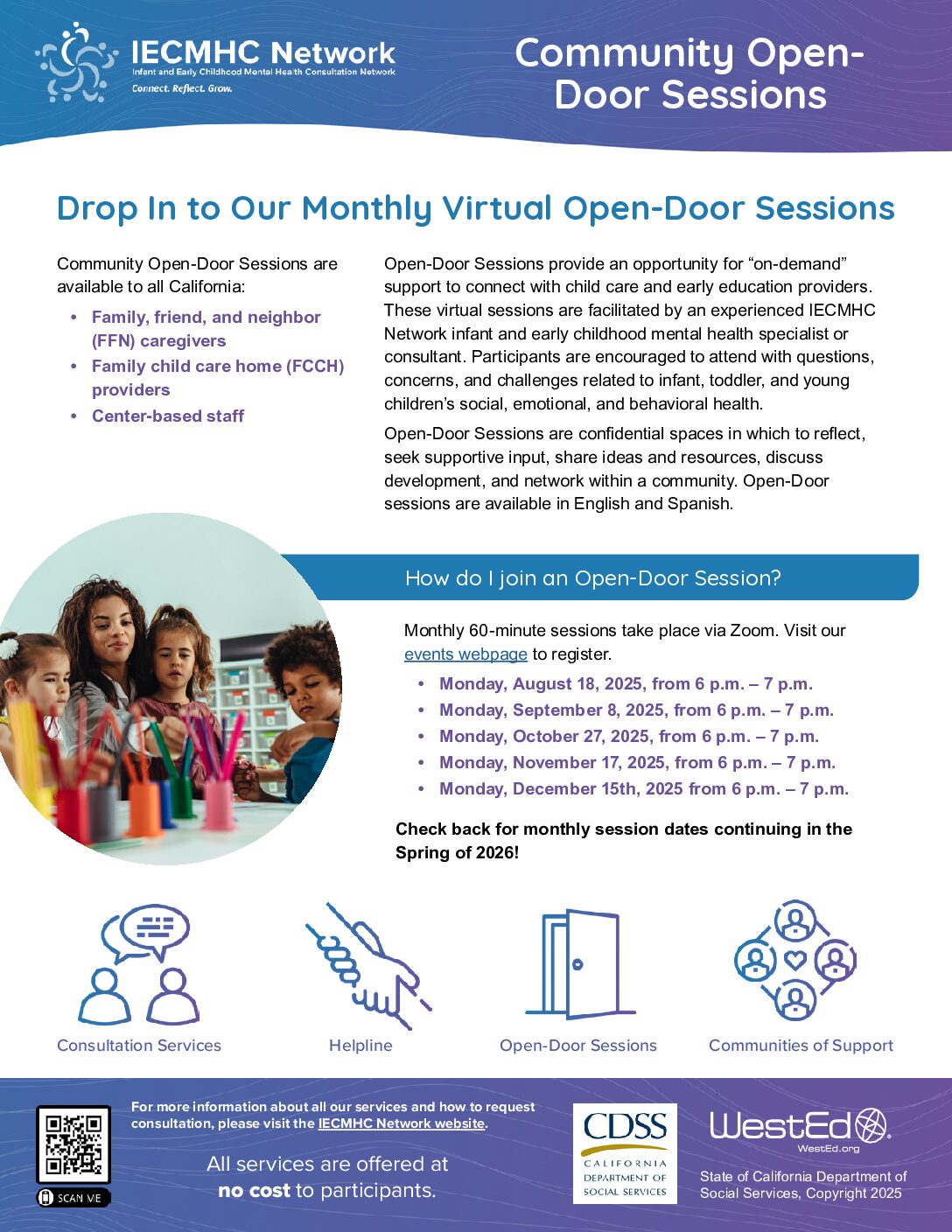 Open-Door Sessions are an opportunity for any early learning and care provider in California to participate in virtual “on-demand” consultation with other early learning caregivers. These sessions are facilitated by an experienced IECMHC Network Infant and Early Childhood Mental Health Specialist or Consultant. Participants are encouraged to attend with questions, concerns, and challenges related to infant, toddler, and young children’s social, emotional, and health. The Open-Door is intended to be a confidential space to reflect, seek supportive input, share ideas and resources, discuss development, and network within a community. There will be one 60-minute session every month. Dates for upcoming Open-Door sessions and links to registration can be found on the IECMHC Network upcoming events page.