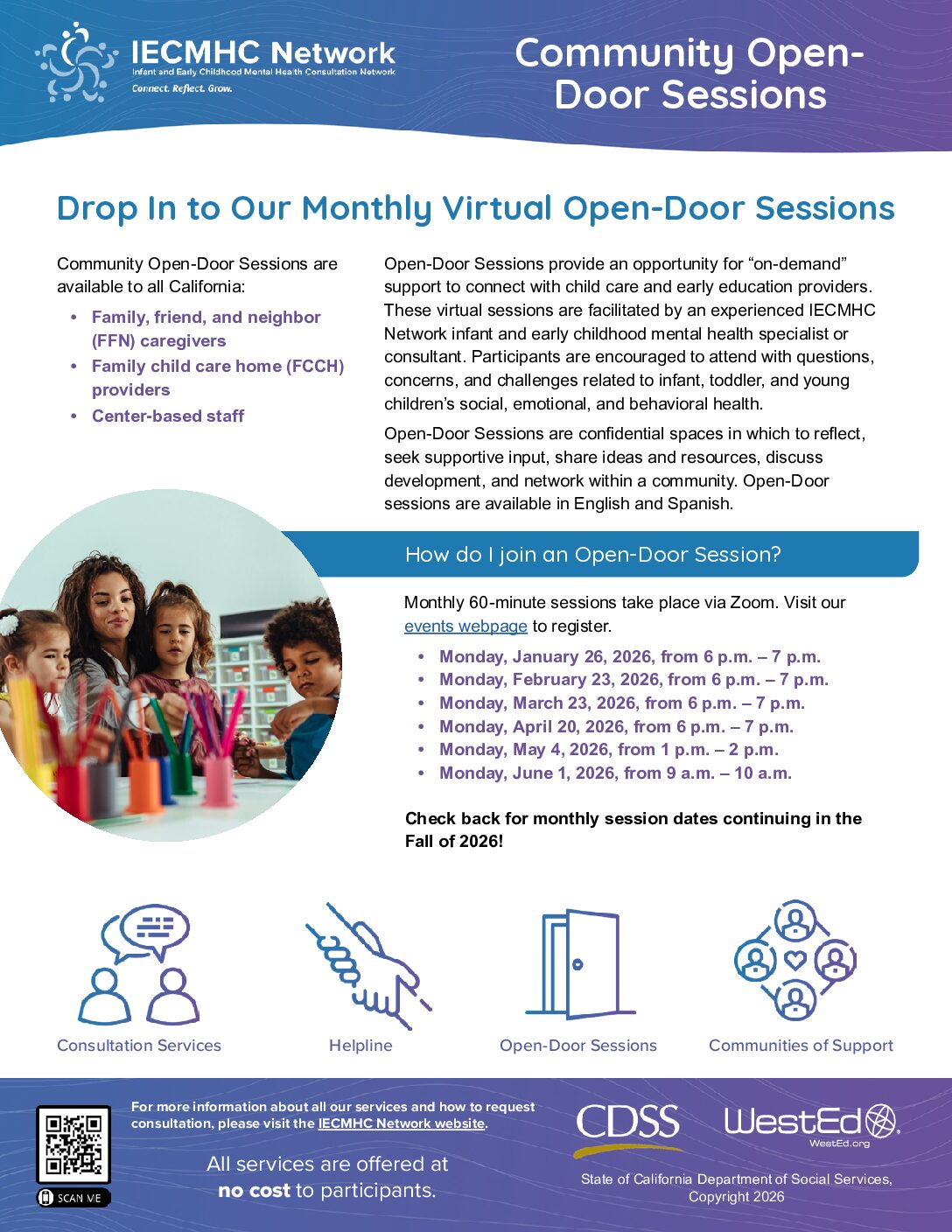 Open-Door Sessions are an opportunity for any early learning and care provider in California to participate in virtual “on-demand” consultation with other early learning caregivers. These sessions are facilitated by an experienced IECMHC Network Infant and Early Childhood Mental Health Specialist or Consultant. Participants are encouraged to attend with questions, concerns, and challenges related to infant, toddler, and young children’s social, emotional, and health. The Open-Door is intended to be a confidential space to reflect, seek supportive input, share ideas and resources, discuss development, and network within a community. There will be one 60-minute session every month. Dates for upcoming Open-Door sessions and links to registration can be found on the IECMHC Network upcoming events page.